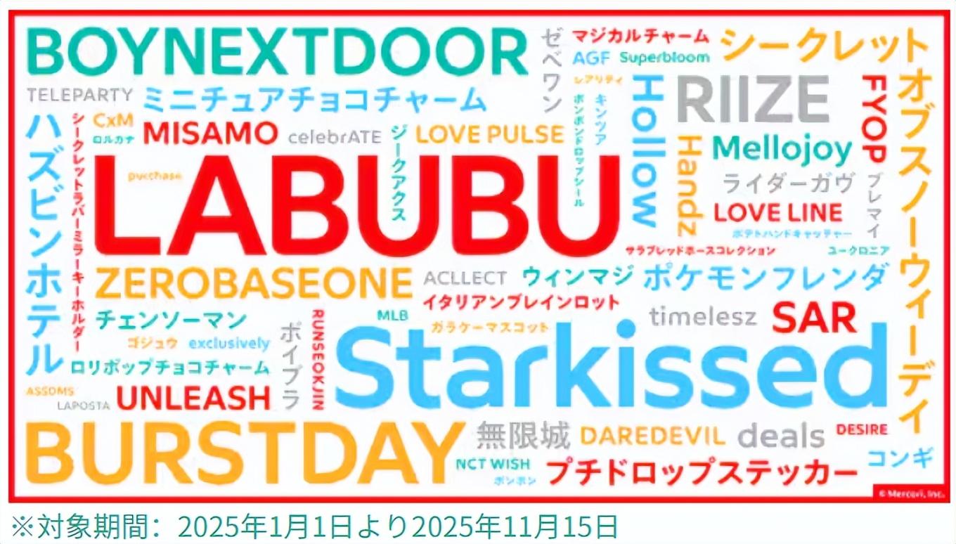 2025年,在煤炉上搜索次数最多的关键词是LABUBU,宝可梦、鬼灭之刃、吉伊卡哇、海贼王等角色漫画相关关键词在搜索TOP10中占据五位。而交易量急速上升的商品中,第一、二名都是卡牌,分别是名侦探柯南卡牌和hololive Carddass。年度最流行词汇也是LABUBU,其次韩国男子组合相关词汇占流行词汇TOP10的60%,K-POP市场再度活跃。