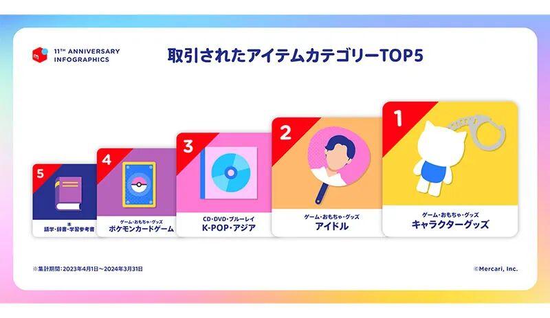 到2024财年(2023.4-2024.3),煤炉的娱乐·爱好类别商品交易占比,进一步提升到41%,交易量TOP5依次是角色谷子、偶像周边、K-POP、宝可梦卡牌、语言・词典・学习参考书。
