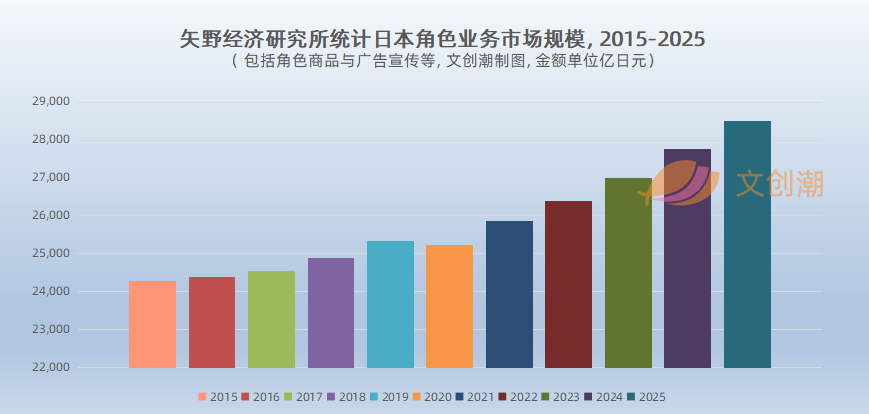 根据矢野经济研究所发布的最新调查,截至到2025年3月,日本国内角色业务(包括角色商品、广告宣传、服务等)的年度市场规模将达到2.85万亿日元(折算人民币超千亿元),比上一年增长2.6%。