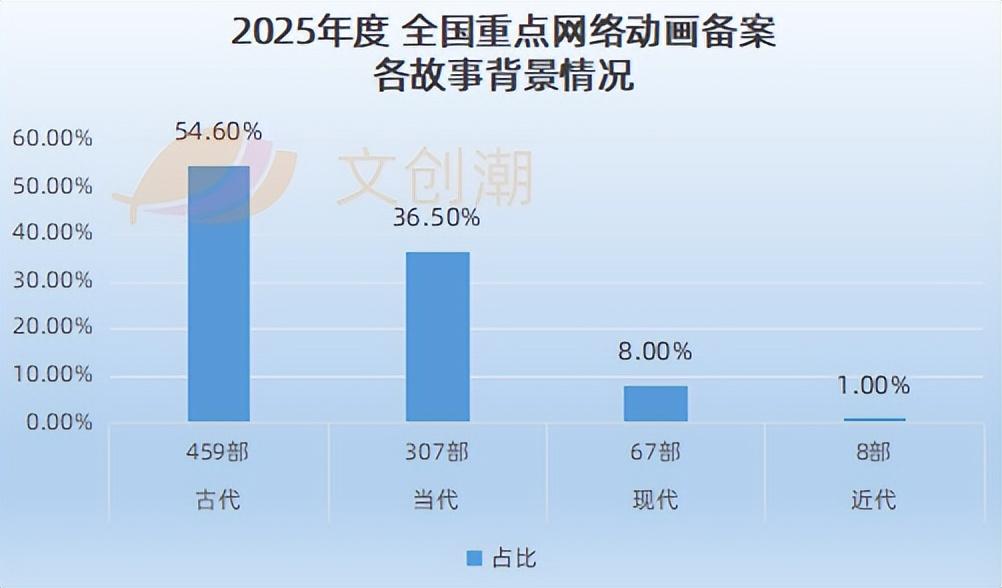 从故事背景来看,古代背景以459部占据超一半,达54.6%;当代背景以307部占比36.5%紧随其后,两者合计占比超过总量的90%。而现代和近代一共75部,占比仅9%。