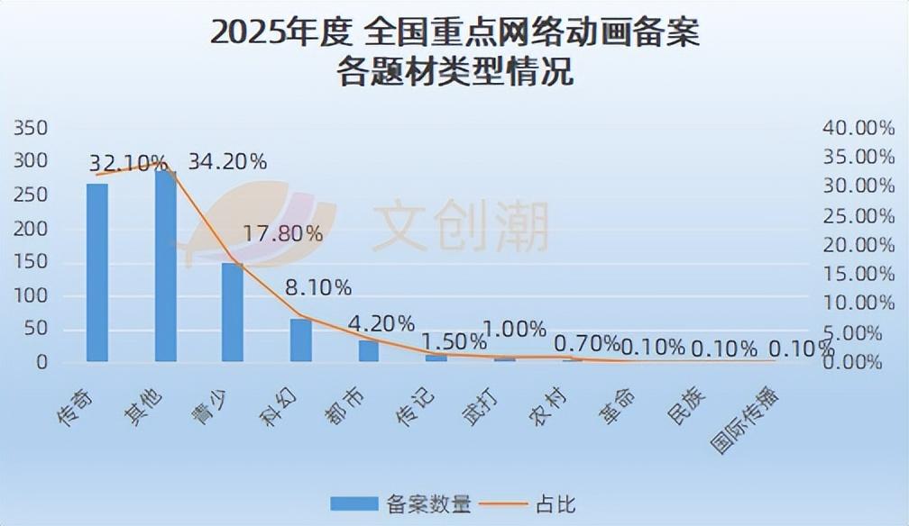 从题材来看,包含玄幻、修仙、武侠类的传奇题材有270部,占比达32.1%;面向青少年或儿童教育成长的青少题材150部,占比17.8%;包括未来科技、太空、AI等的科幻题材68部,占比8.1%;都市题材28部,占比4.2%;除此之外,未明确归类或其他题材共318部,占比37.8%。