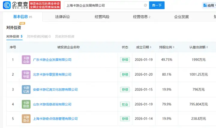 最近几天(工商信息显示是从1月14到1月20日),卡游连续参与设立了5家合资公司。