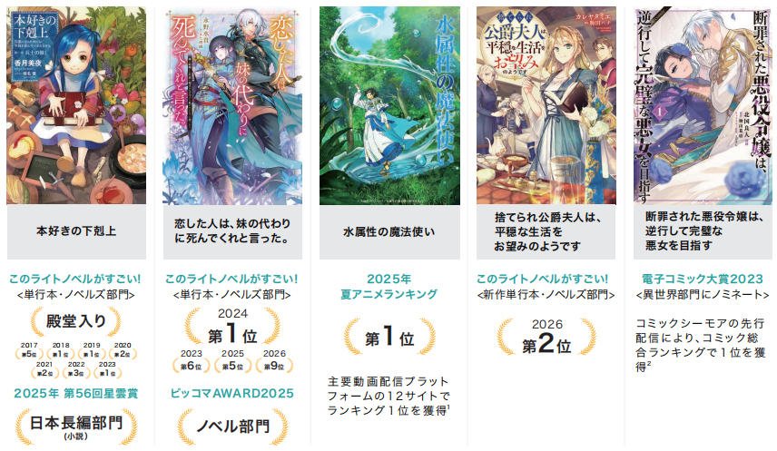 其中,《小书痴的下克上》是它成绩最瞩目的IP之一,系列累计销量超1200万部。2022年在“这本轻小说真厉害!2023”单行本·小说部门中当选殿堂级作品,自17年至23年期间一直在该榜单前五名。