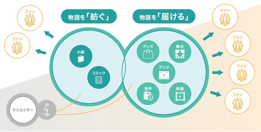 “传播”板块即多媒体发展,根据作品特点,通过动画、2.5次元舞台剧、音乐剧、电影、广播剧、有声书、周边商品和活动等,更加立体地扩展作品世界,丰富IP价值,延续IP寿命,将IP价值最大化。通过在公司内部配备书籍制作、电子制作、设计、音响录制和在线销售功能,实现了在不破坏世界观的前提下兼顾速度与质量的进行多媒体发展。
