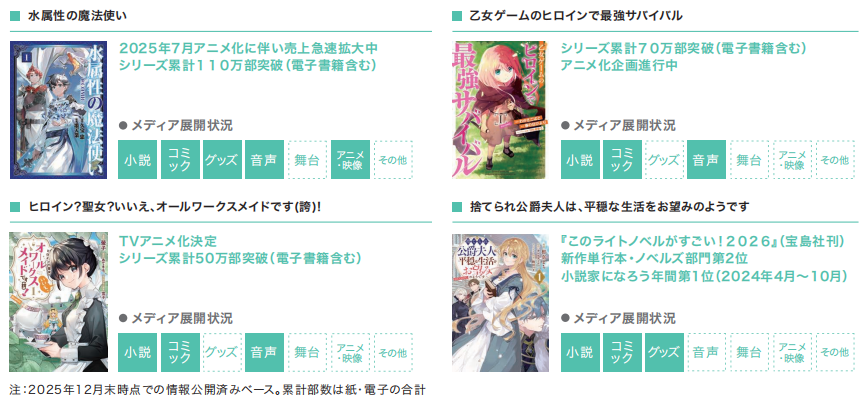 《水属性的魔法师》获得了电子书商店“Reader Store”25年年度付费畅销榜轻小说榜第三名,其电视动画在12大视频网站上拿下了25年夏季动画排行榜首位。