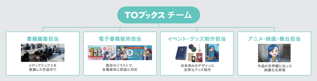 TO Books表示其将企划、编辑、书籍·广播剧·舞台·动画·周边制作、销售等功能集中在公司内部,构建从IP创造到推广一气呵成推进的体制,这也是其区别于传统出版社的一个特点。