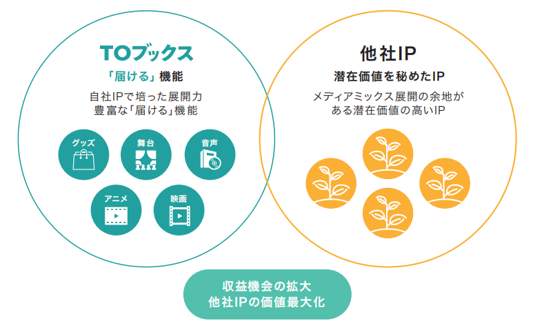 TO Books强调其采用从IP的发掘、编辑阶段到漫画化、声音化、舞台化、动画化等全方位一体设计的“IP制作型”媒体组合战略。根据各作品的世界观、读者群体及市场热度,为每部作品选择最适合的媒体组合路线和展开顺序。