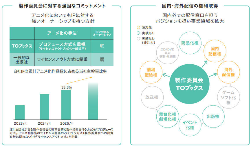IP动画化方面,TO Books将加大作为制作委员会的组织法或牵头方参与其中的力度,非常重视对IP的所有权。其作为制作委员会制作的自有IP动画占比,在2025年4月期已达到33.3%。