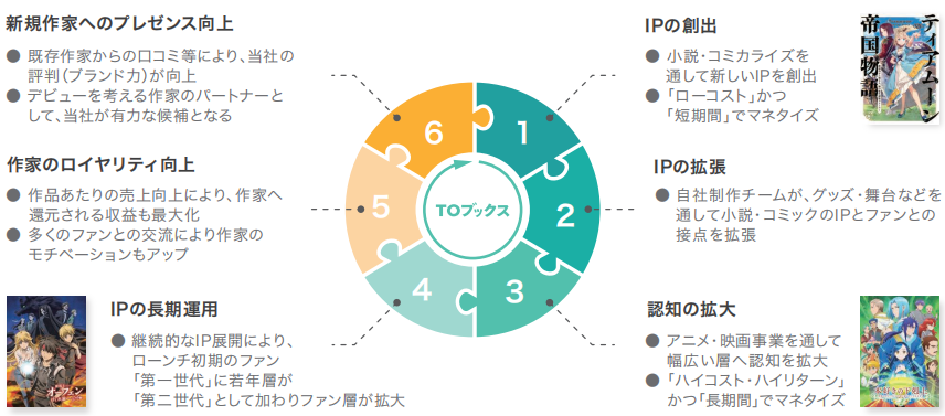 TO Books以投稿平台等为起点,综合利用多个阶段获得的读者反馈和销售数据,在判断故事价值的基础上推进IP化,声称已建立能够快速掌握市场动向和读者需求的体系。