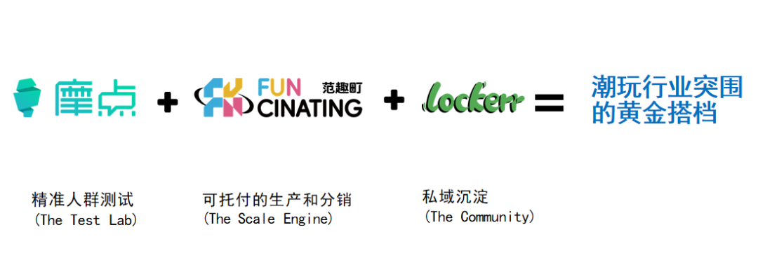 黄胜利给出了他们的方案:用摩点的精准人群测试,结合范趣町的“可托付”生产和分销,辅以潮玩用户社区Lockerr的私域沉淀,帮助合作伙伴实现角色转换,降低风险、提高效率。