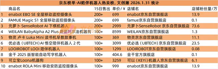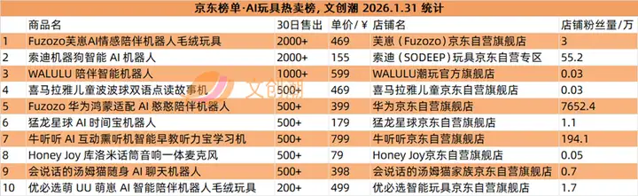 京东榜单每日更新,文创潮1月31日统计到的AI陪伴机器人热卖榜、AI玩具热卖榜前十名,如图所示。