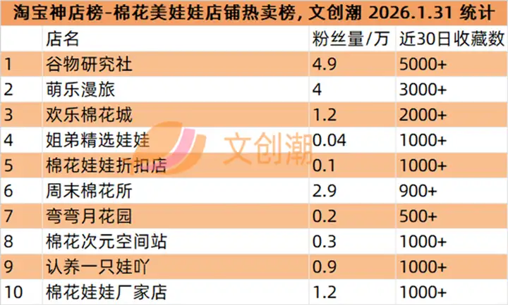 棉花美娃娃店铺热卖榜,前五名分别是: