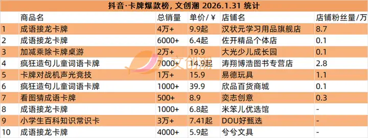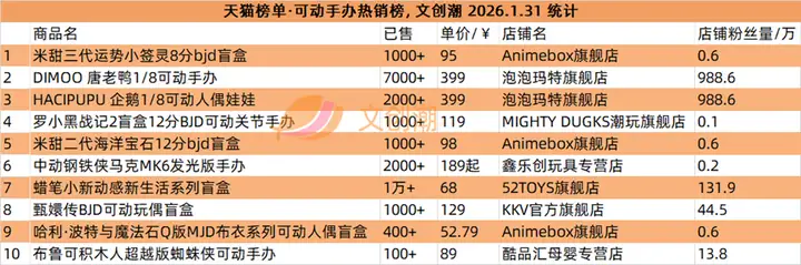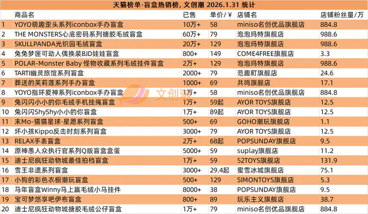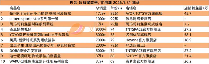 抖音平台榜单每日更新,文创潮1月31日统计到的盲盒、卡牌爆款前十名,如图所示。
