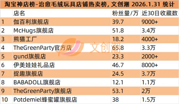 伽百利旗舰店、McHugs旗舰店、熊猫工厂、TheGreenParty官方店、gund旗舰店。
