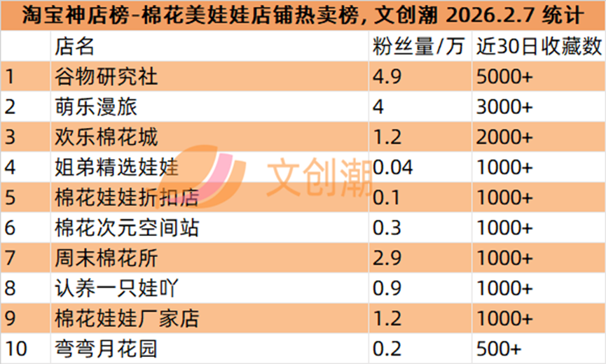 棉花美娃娃店铺热卖榜,前五名分别是: