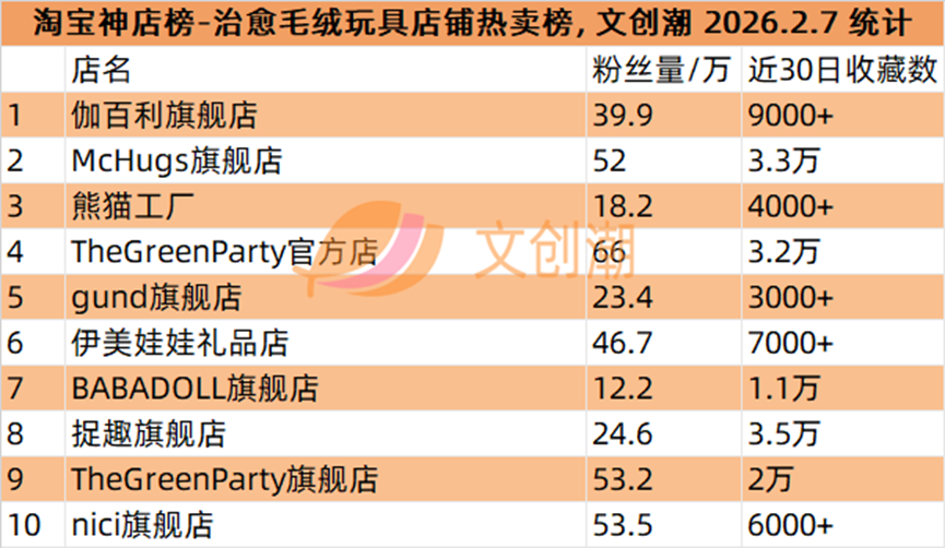 伽百利旗舰店、McHugs旗舰店、熊猫工厂、TheGreenParty官方店、gund旗舰店。