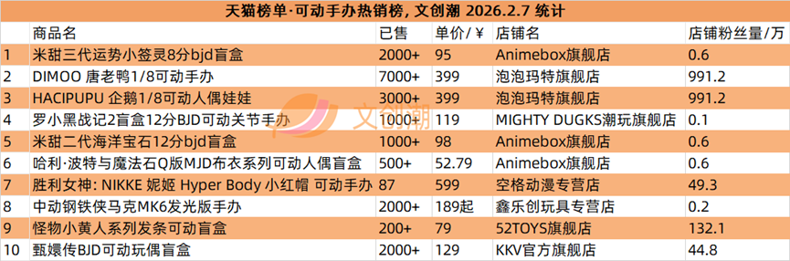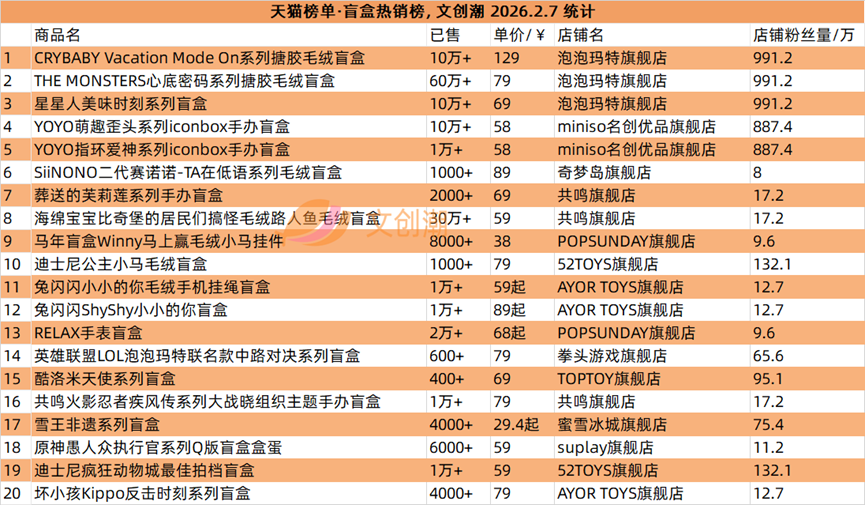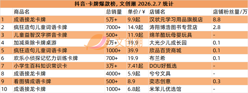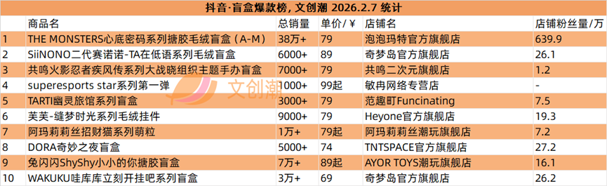 抖音平台榜单每日更新,文创潮2月7日统计到的盲盒、卡牌爆款前十名,如图所示。