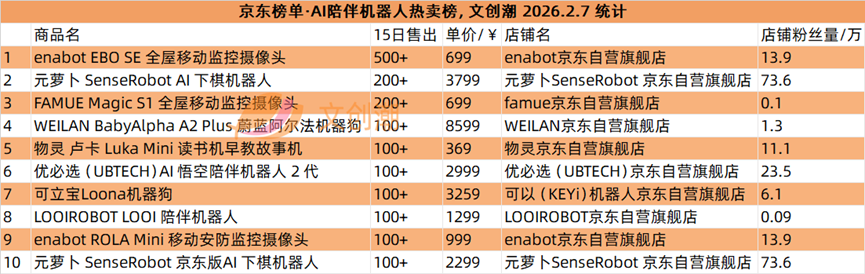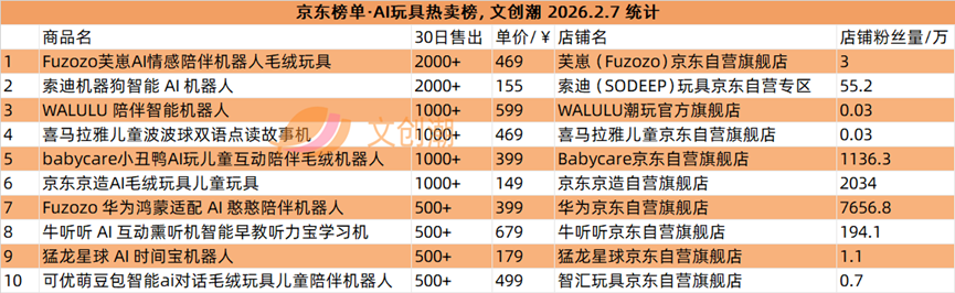 京东榜单每日更新,文创潮2月7日统计到的AI陪伴机器人热卖榜、AI玩具热卖榜前十名,如图所示。