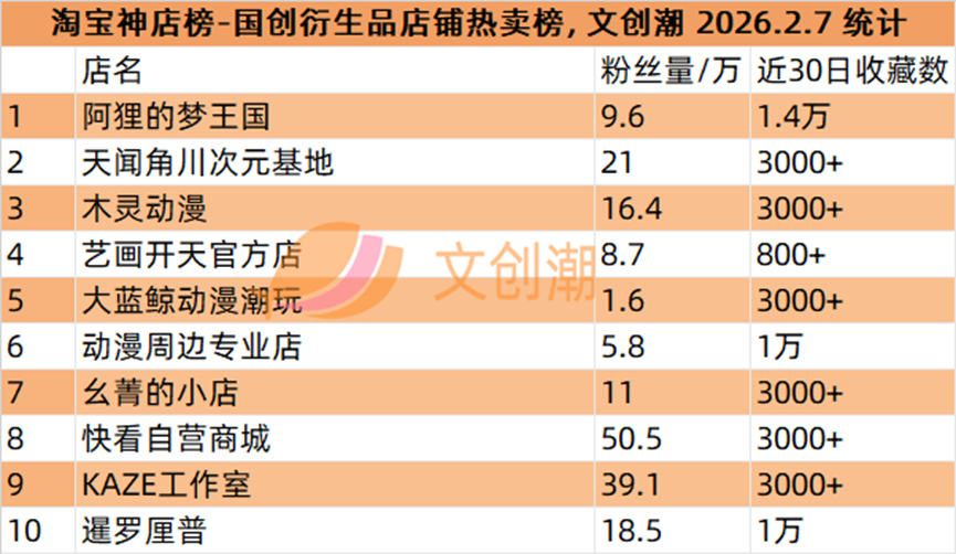 国创衍生品店铺热卖榜,前五名分别是: