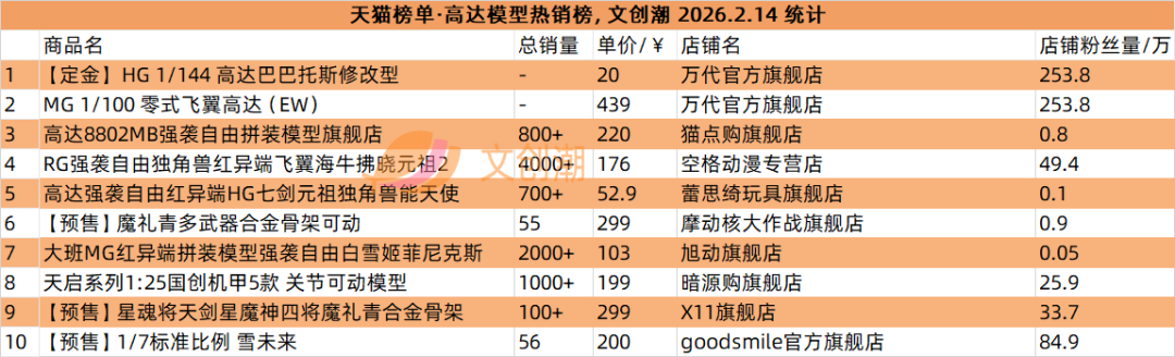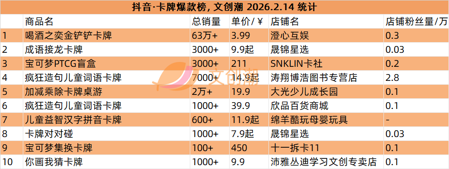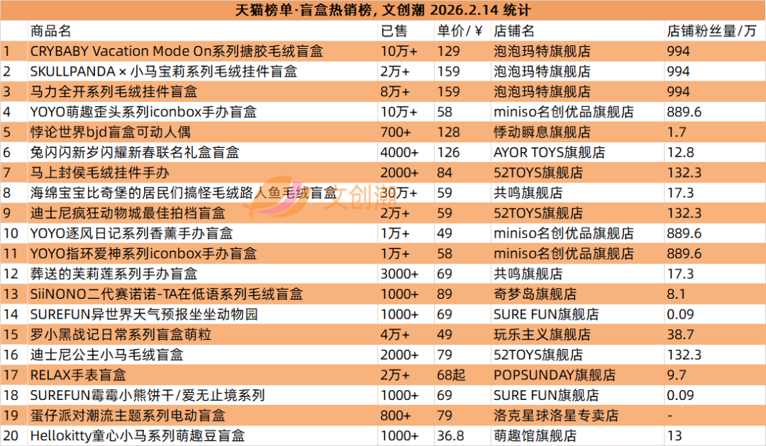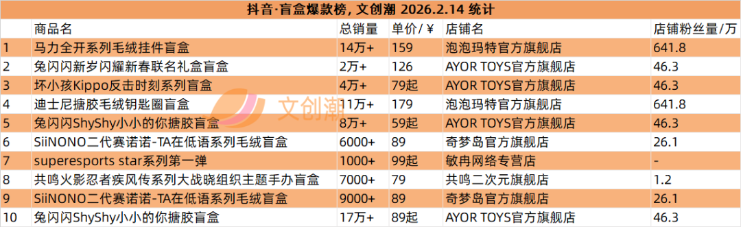 抖音平台榜单每日更新,文创潮2月14日统计到的盲盒、卡牌爆款前十名,如图所示。