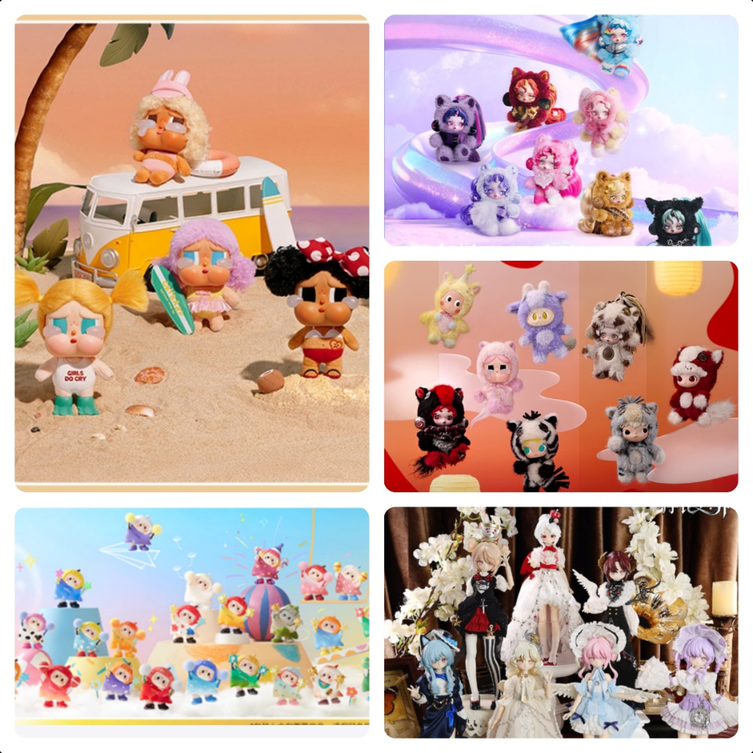 本期天猫榜单盲盒热销榜,前五名分别是泡泡玛特的CRYBABY Vacation Mode On系列搪胶毛绒盲盒、SKULLPANDA联名小马宝莉毛绒盲盒、马力全开毛绒盲盒、名创优品的YOYO萌趣歪头系列盲盒、悸动瞬息的悖论世界BJD盲盒可动人偶。