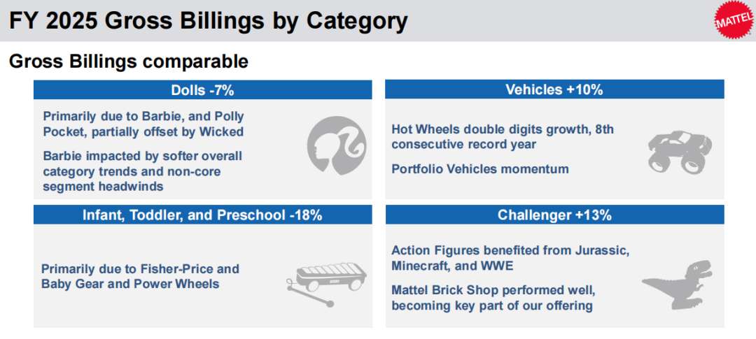 2025全年,美泰的芭比IP拿下12.04亿美元的毛收入,同比下滑12%。美泰预计该IP将在2027年重新开始增长(也就是说今年还会衰退);风火轮系列的毛收入为17.50亿美元,同比增长11%;费雪品牌毛收入6.22亿,同比减少12%。