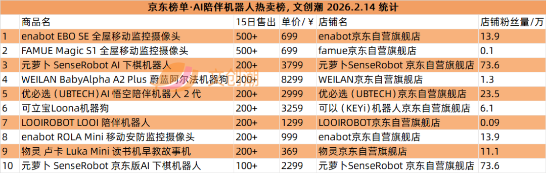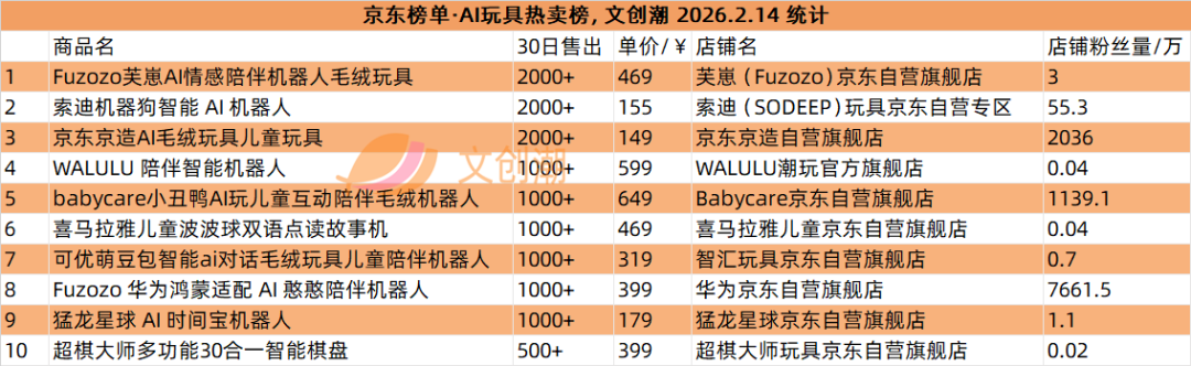 京东榜单每日更新,文创潮2月14日统计到的AI陪伴机器人热卖榜、AI玩具热卖榜前十名,如图所示。