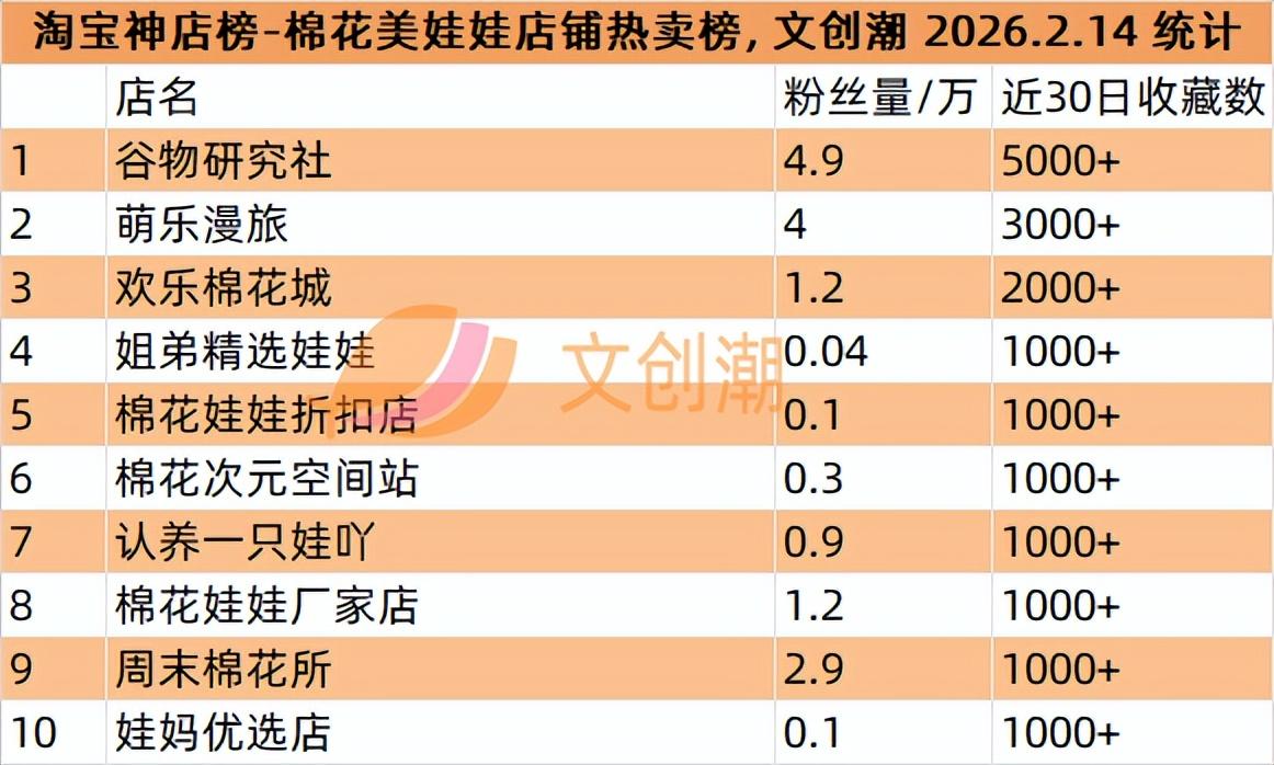 棉花美娃娃店铺热卖榜,前五名分别是: