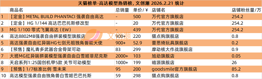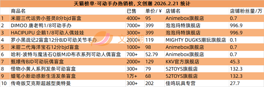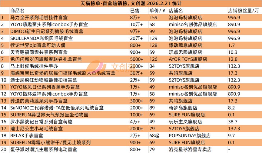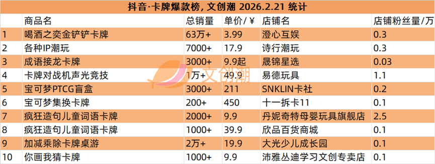 抖音平台榜单每日更新,文创潮2月21日统计到的盲盒、卡牌爆款前十名,如图所示。