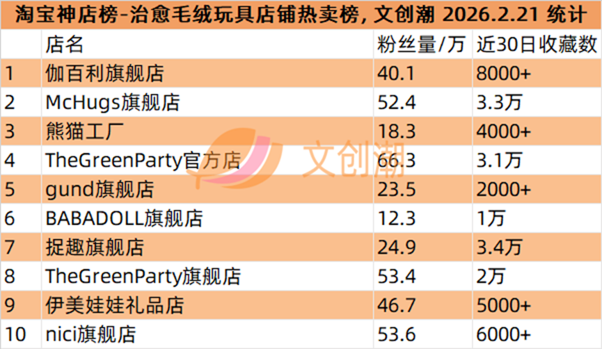伽百利旗舰店、McHugs旗舰店、熊猫工厂、TheGreenParty官方店、gund旗舰店。