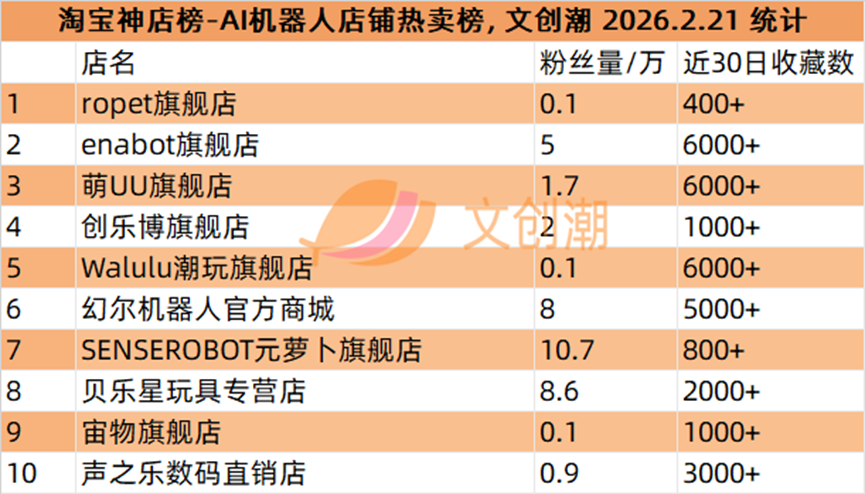 ropet旗舰店、enabot旗舰店、萌UU旗舰店、创乐博旗舰店、Walulu潮玩旗舰店。