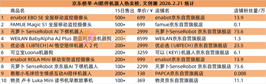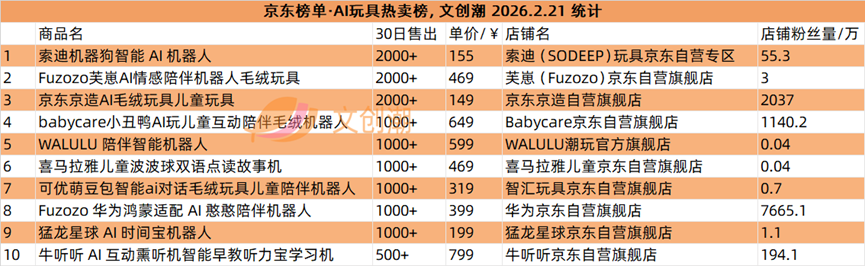 京东榜单每日更新,文创潮2月21日统计到的AI陪伴机器人热卖榜、AI玩具热卖榜前十名,如图所示。