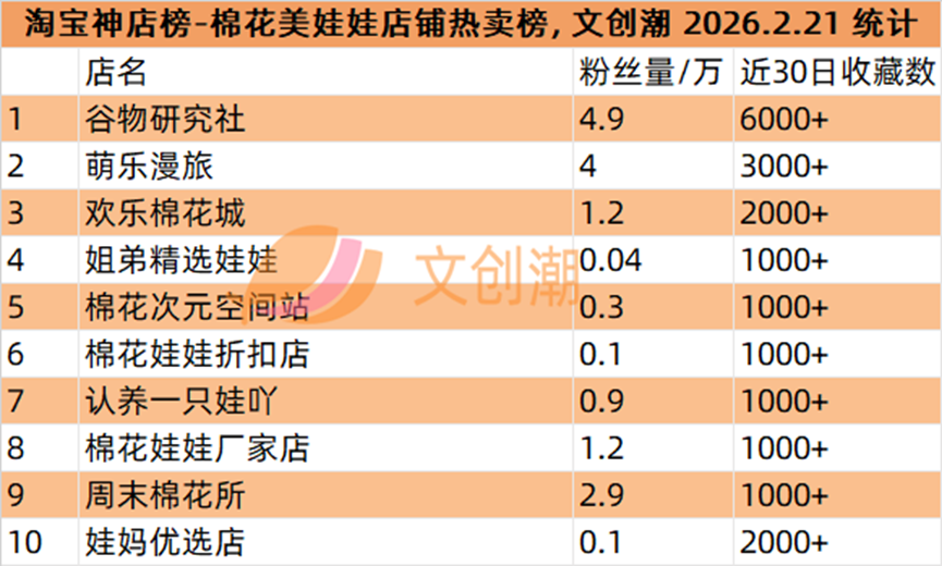 棉花美娃娃店铺热卖榜,前五名分别是: