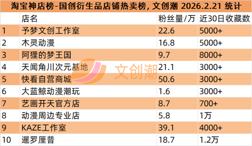 国创衍生品店铺热卖榜,前五名分别是: