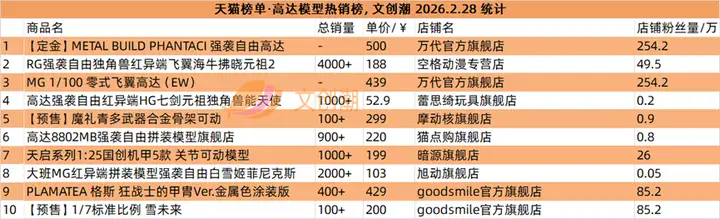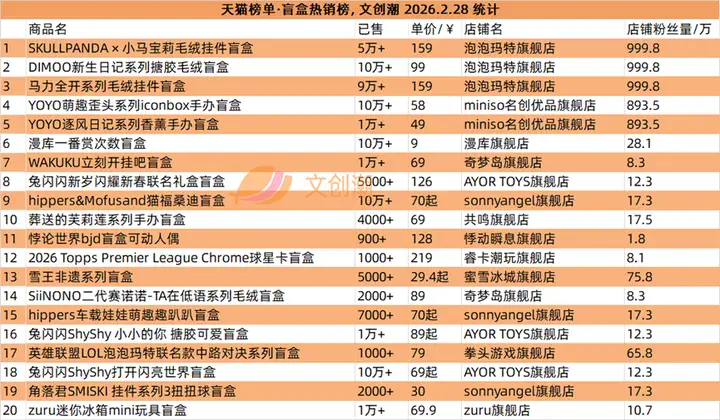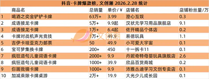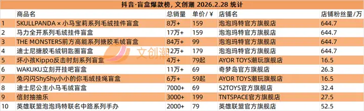 抖音平台榜单每日更新,文创潮2月28日统计到的盲盒、卡牌爆款前十名,如图所示。