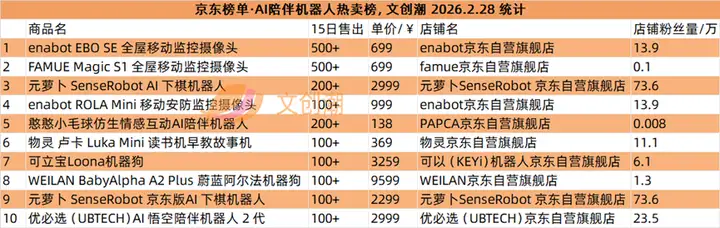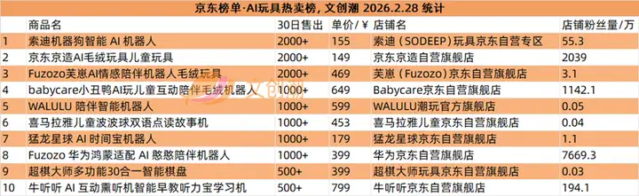 京东榜单每日更新,文创潮2月28日统计到的AI陪伴机器人热卖榜、AI玩具热卖榜前十名,如图所示。
