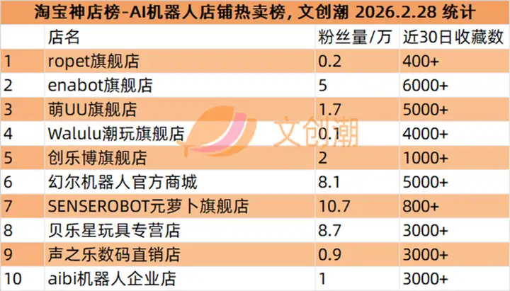 ropet旗舰店、enabot旗舰店、萌UU旗舰店、Walulu潮玩旗舰店、创乐博旗舰店。