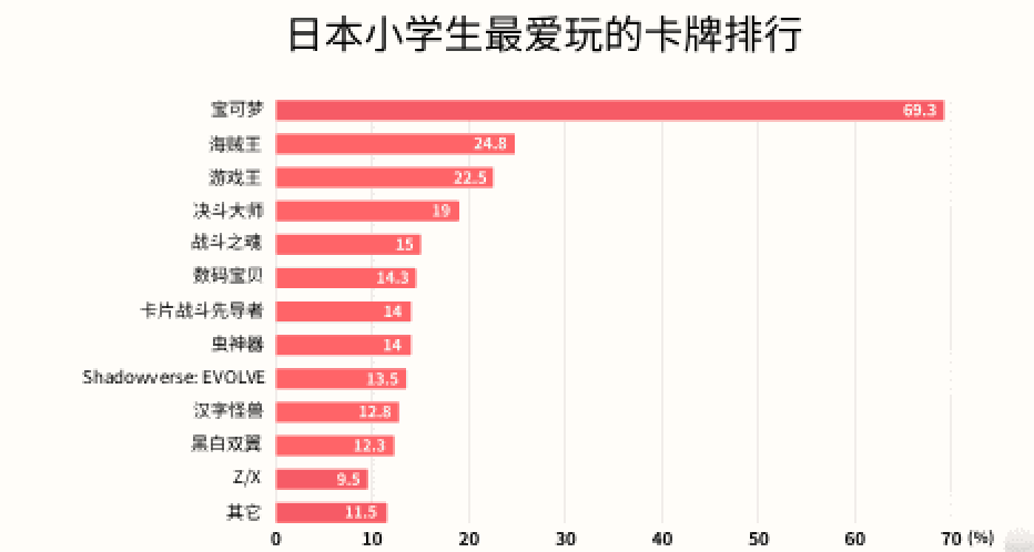 结果显示,宝可梦PTCG以69.3%的大比例位列第一,海贼王OPCG占比24.8%排在第二,第三位是游戏王占比22.5%,第四位决斗大师DM占比19%,第五是战斗之魂占比15%。基本是目前日本卡牌界最热门,且有注重培养儿童玩家的几款。