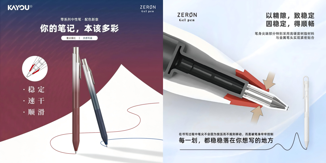 卡游文具的高水准工艺,在其他产品线也有体现。比如2025年12月官宣周笔畅作为代言人的卡游“零系列”中性笔,主打“笔笔顺畅”。