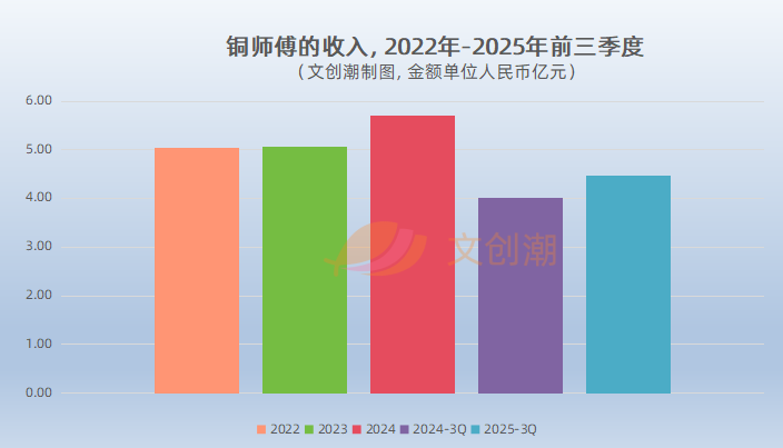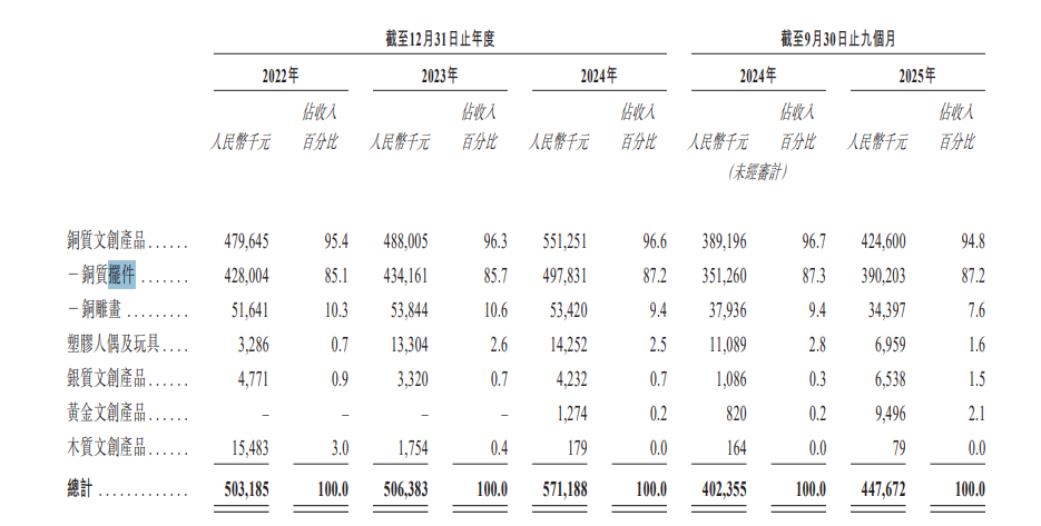 招股书披露,2022-2024三个年度与2024年和2025年前三季度,铜师傅的铜质文创产品收入分别为人民币4.8亿、4.88亿、5.51亿、3.89亿和4.25亿元,分别占同期总收入的95.4%、96.3%、96.6%、96.7%和94.8%。