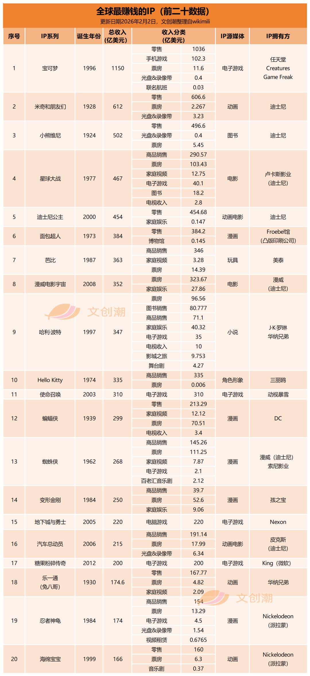 几年前,文创潮基于wikimili统计,整理了全球IP榜单。在文章中,我们特别指出那些榜单难免会有错误或缺漏,不完整也不完全准确,但依然有参考价值。