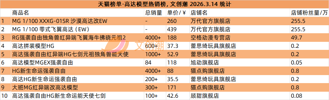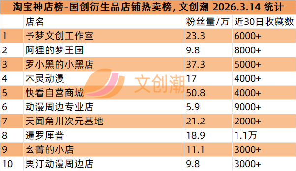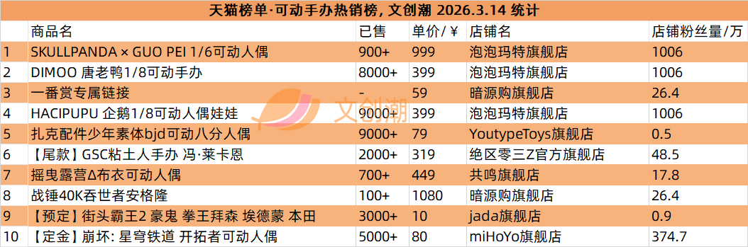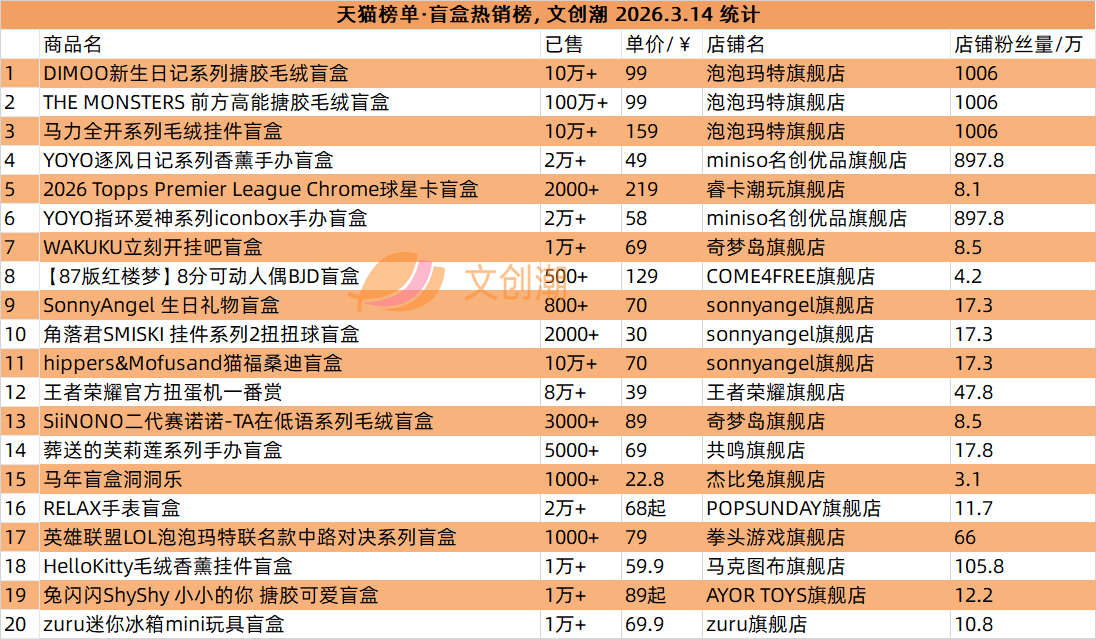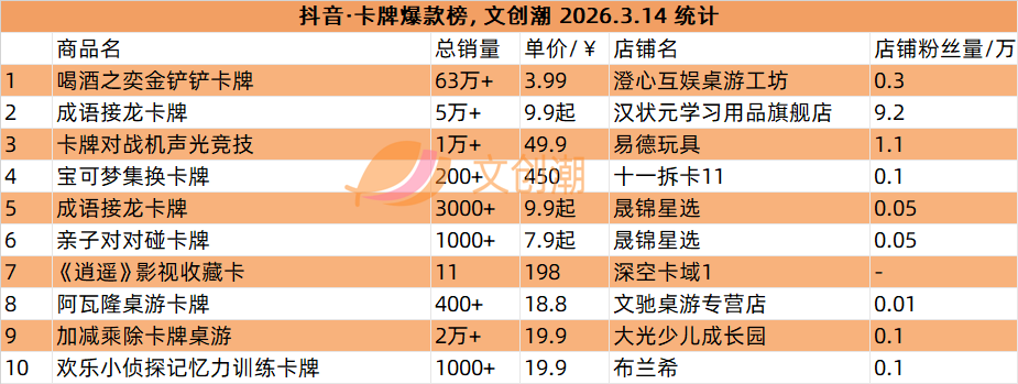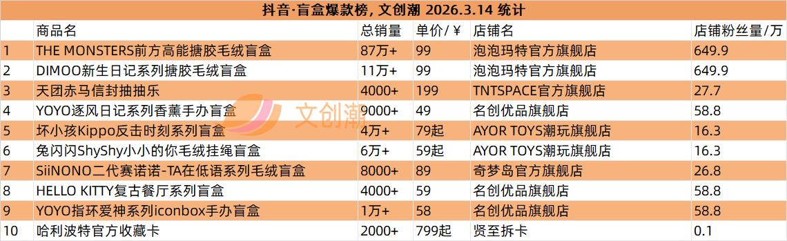 抖音平台榜单每日更新,文创潮3月14日统计到的盲盒、卡牌爆款前十名,如图所示。
