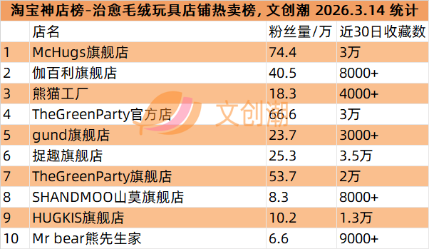 McHugs旗舰店、伽百利旗舰店、熊猫工厂、TheGreenParty官方店、gund旗舰店。