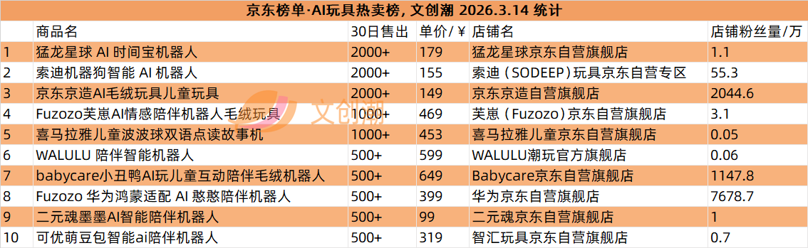 京东榜单每日更新,文创潮3月14日统计到的AI陪伴机器人热卖榜、AI玩具热卖榜前十名,如图所示。