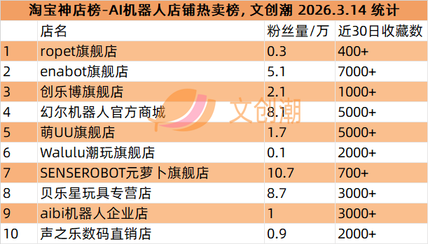 ropet旗舰店、enabot旗舰店、创乐博旗舰店、幻尔机器人官方商城、萌UU旗舰店。