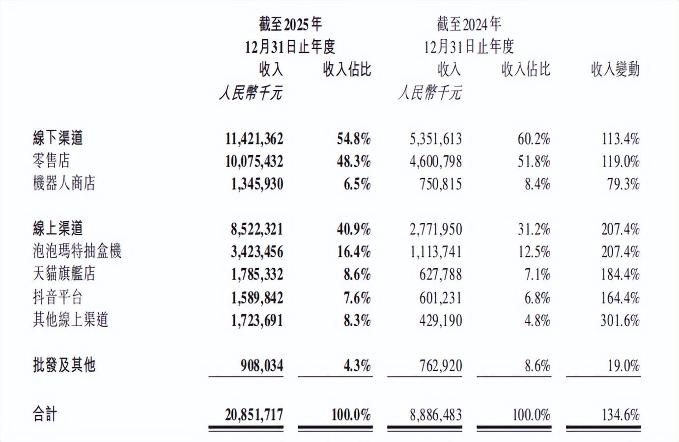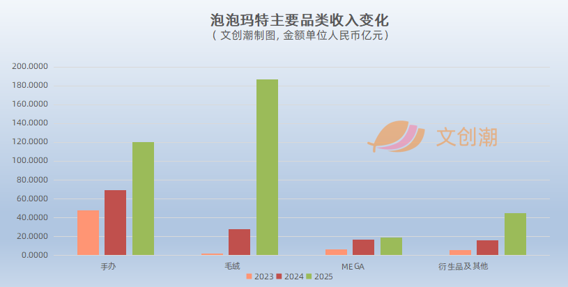 品类方面,泡泡玛特去年的毛绒产品收入达187.08亿元,同比激增560.6%,占总收入的比例从21.7%跃升至50.4%,首次成为第一大产品品类。