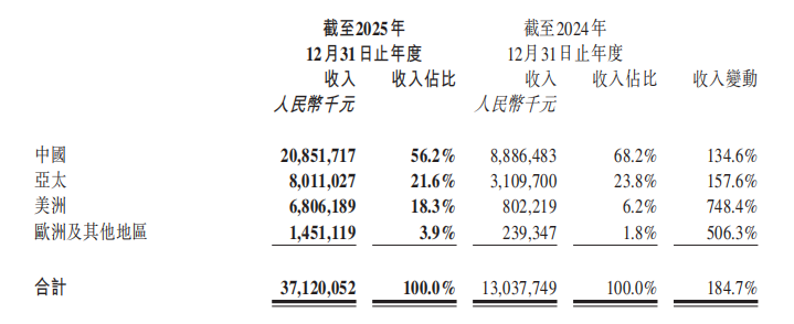 泡泡玛特将全球市场划分为中国、亚太、美洲、欧洲及其它,一共四个区域,2025年的收入占比分比为56.2%、21.6%、18.3%、3.9%,增速分别为134.6%、157.6%、748.4%、506.3%。