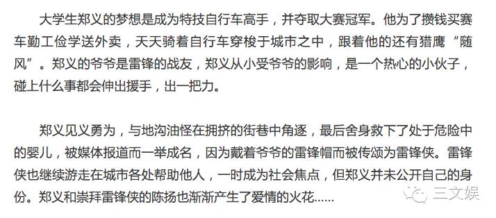 《新疆日报》介绍的电影剧情梗概。在校大学生郑义在雷锋精神的感召下,化身超级英雄“雷锋侠”。