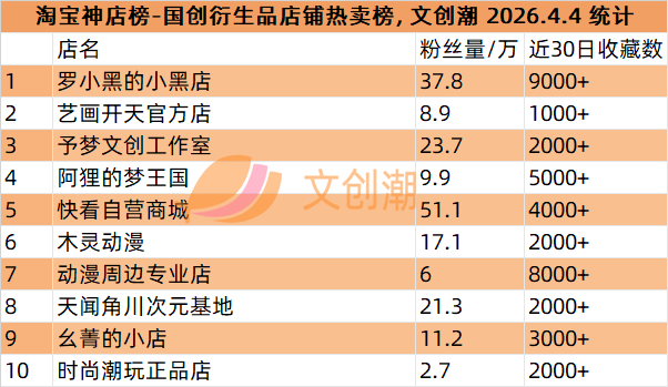 国创衍生品店铺热卖榜,前五名分别是:
