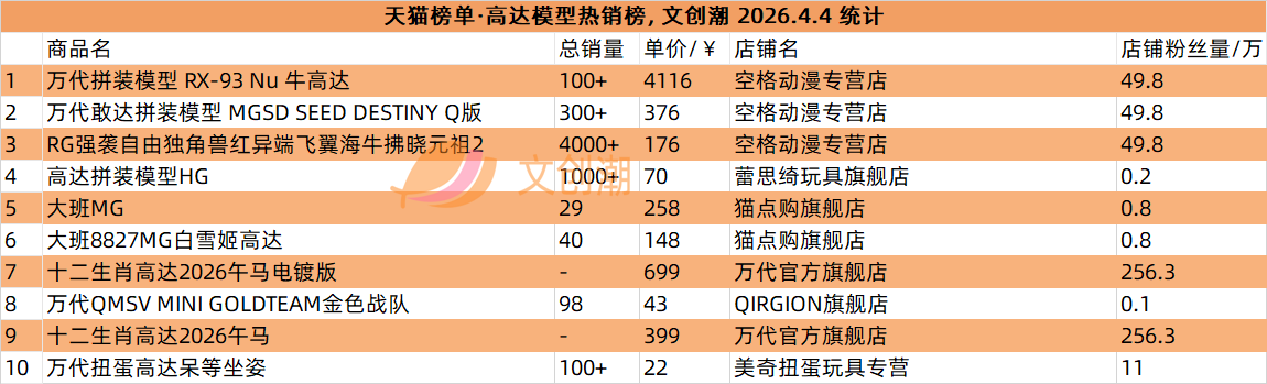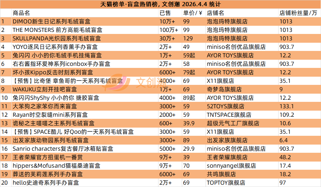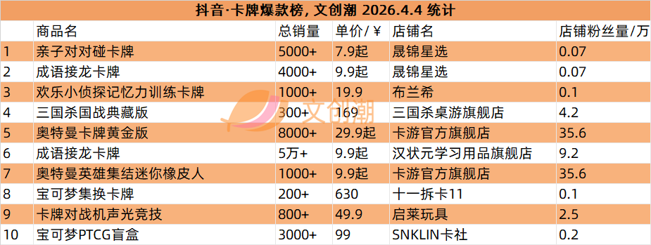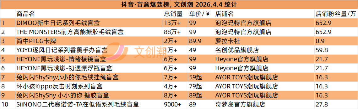 抖音平台榜单每日更新,文创潮4月4日统计到的盲盒、卡牌爆款前十名,如图所示。